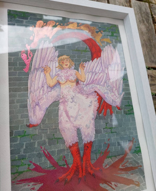 An A4 sized painting made with watercolours, duochrome micah paints and fineliners. The painting comes in a white frame (the frame has some minor damage)